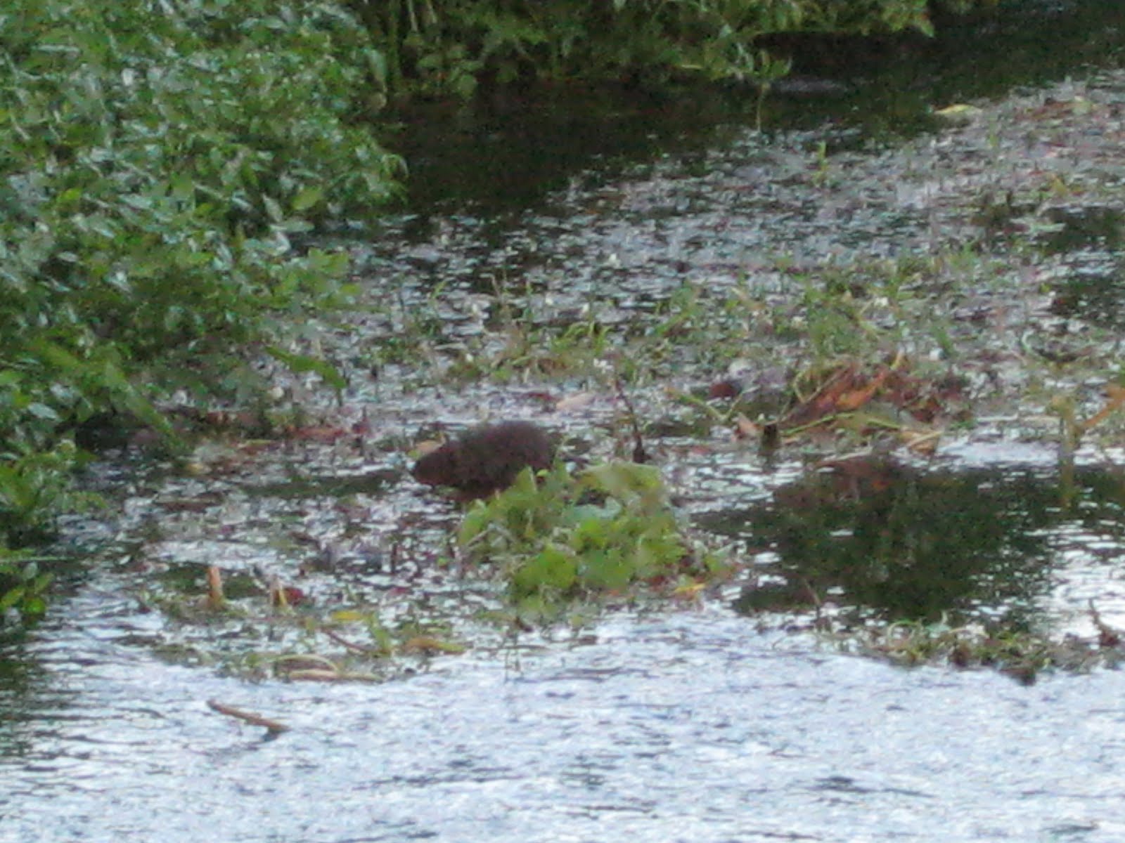 I then put my bins onto my first ever Water Vole! It had come out of the reed line about 30 yards downstream from us and started to feed out in the open. We were both surprised how big it was. Started checking the well rehearsed ID features in my head - nice blunt nose, no sign of any ears, chesnut brown fur, union jack underpants. I managed to get these 'record' shots off before it popped back into the reeds. (note this is my pocket camera on full zoom!)